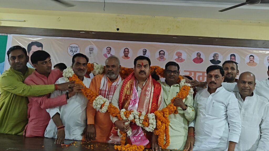 भाजपा कार्यालय महाराजगंज पर नवनियुक्त जिला अध्यक्ष संजय पांडे का स्वागत समारोह संपन्न हुआ। ।। आज भारतीय जनता महराजगंज मुख्यालय स्थितपार्टी कार्यालय पर डॉ श्यामा प्रसाद मुखर्जी और पंडित दीन दयाल उपाध्याय जी के चित्र पर पुष्प अर्पित कर बैठक की शुरुआत हुई। कार्यालय पर बड़ी माला पहना कर स्वागत कियागया कार्यक्रम की अध्यक्षता कर रहे पूर्व जिलाध्यक्ष परदेसी रविदास किया। अपने स्वागत से अभिभूत नवनियुक्त जिलाध्यक्ष अशोक पांडेय उर्फ संजय पांडेय ने कहा कि मुझको जिलाध्यक्ष का दायित्व देकर शीर्ष नेतृत्व ने मेरा और जिले कार्यकर्ताओं का मान बढ़ाया है। इस मंच से मैं कार्यकर्ताओं को विश्वास दिलाता हूं कि 24 घंटे कार्यकर्ताओं के लिए उपलब्ध रहूंगा। जिलाध्यक्ष ने कार्यकर्ताओं का आह्वान करते हुए कहा कि जनपद के सभी कार्यकर्ता अपने अपने बूथ को मजबूत करें जिससे आने वाले चुनाव में हम फिर बढ़त बना सकें। आने वाले विधानसभा चुनाव में हम जिले की चारों सीटों को जीतेंगे। एक एक कार्यकर्ता मेरे परिवार के सदस्य के समान है। जिले के सभी पदाधिकारी जनप्रतिनिधि पार्टी को ताकत देने के लिए पूरे मनोयोग से उठ खड़े हों। कार्यकर्ताओं को किसी भी प्रकार से दबने की जरूरत नहीं है, सभी कार्यकर्ता पार्टी के साथ पूरी ताकत से खड़े हो जाएं। पार्टी आप के साथ हमेशा खड़ी रहेगी। सदर विधायक जय मंगल कन्नौजिया,पूर्व विधायक फरेंदा बजरंग बहादुर पूर्व चेयरमैन कृष्ण गोपाल जायसवाल, जिला उपाध्यक्ष अमरनाथ पटेल, संतोष सिंह, प्रभाकर द्विवेदी, रामाज्ञा निषाद, जिला महामंत्री बबलू यादव, ओम प्रकाश पटेल, संजय वर्मा , जिला मंत्री आशुतोष शुक्ला,गौतम तिवारी, बच्चू लाल चौरसिया , सरोज पांडेय ने भी अपने संबोधन में जिलाध्यक्ष संजय पांडेय का स्वागत किया। इस अवसर पर शिकारपुर मंडल अध्यक्ष विजय कुमार गौड़। हेमंत गु