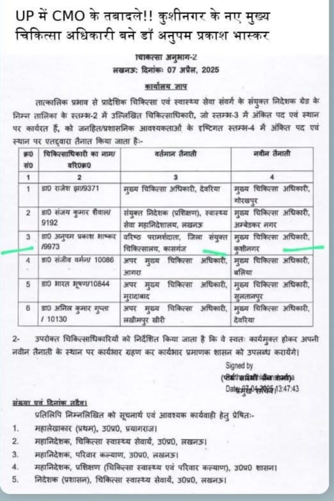 यूपी में सीएमओ के तबादले कुशीनगर के नए सीएमओ बने डॉक्टर अनुपम प्रकाश भास्कर सहित 6 सीएमओ के तबादले