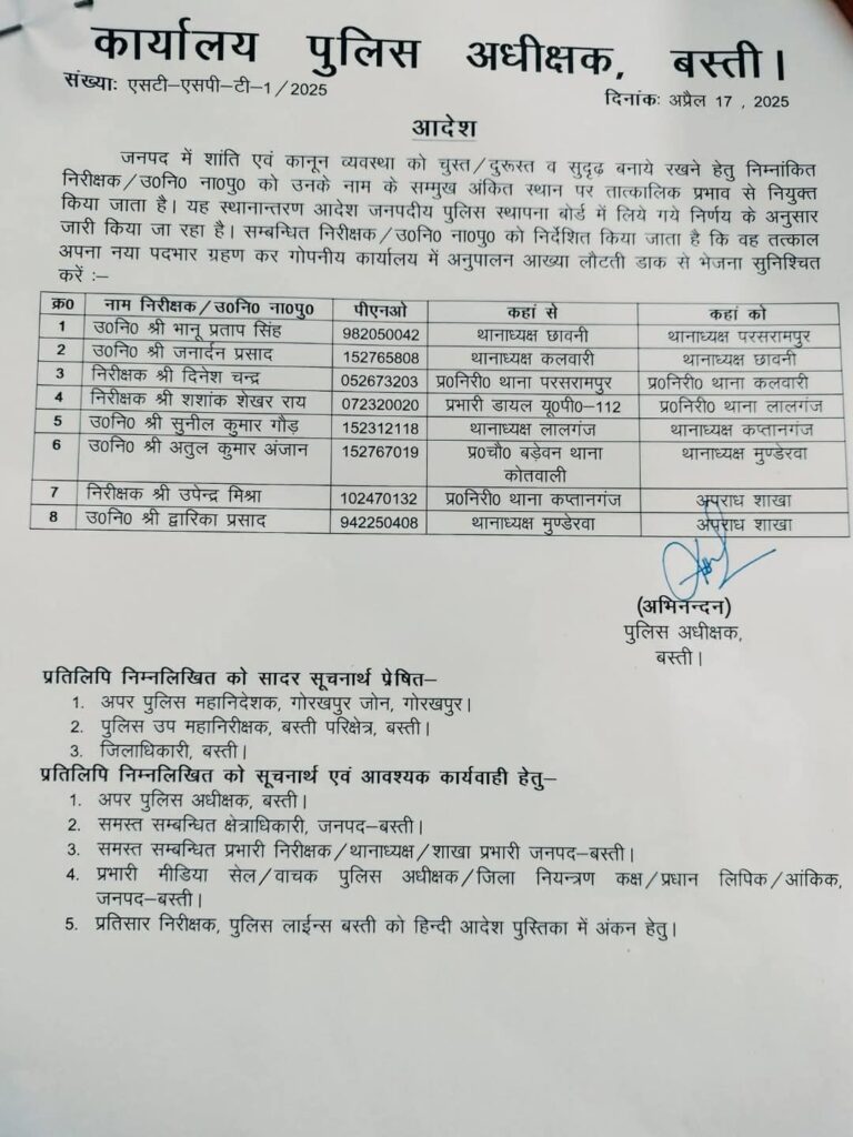 - ऋतुंजय यादव अति0निरी0 थाना परशुरामपुर से अति0 निरी0 थाना हरैया बनाए गए।