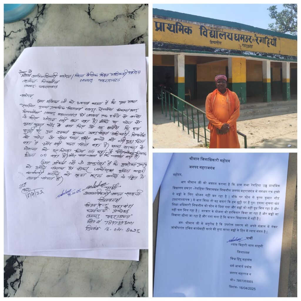 महाराजगंज जनपद के निचलौल ब्लॉक के ग्राम सभा रेंगहिया उच्च प्राथमिक विद्यालय रेंगहिया धमउर में योगी आदित्यनाथ सरकार की धज्जियां उड़ाई जा रही हैं यहां मध्याह्न भोजन योजना, भारत सरकार की एक योजना है जिसके अन्तर्गत पूरे देश के प्राथमिक और लघु माध्यमिक विद्यालयों के छात्रों को दोपहर का भोजन निःशुल्क प्रदान किया जाता है। नामांकन बढ़ाने, प्रतिधारण और उपस्थिति तथा इसके साथ-साथ बच्चों में पौषणिक स्तर में सुधार करने के उद्देश्य से