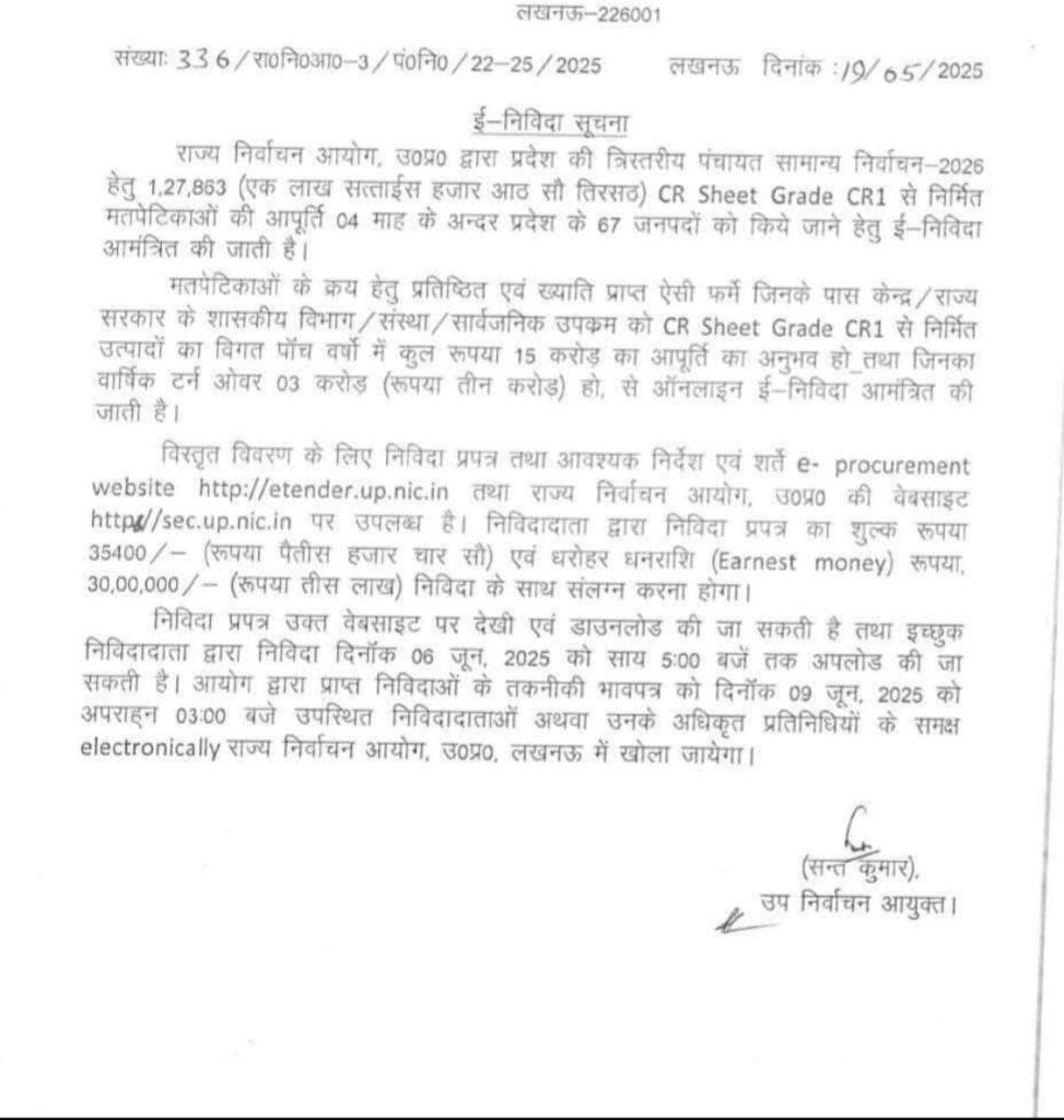 राज्य निर्वाचन आयोग ने प्रदेश के 67 जिलों में त्रिस्तरीय पंचायत सामान्य निर्वाचन-2026 के लिए करीब 1.27 लाख सीआर शीट ग्रेड CR1 से बनी मतपेटियों की आपूर्ति के लिए ई-टेंडर जारी किया है, इन मतपेटियों की डिलीवरी 4 महीने के भीतर पूरी करनी होगी,