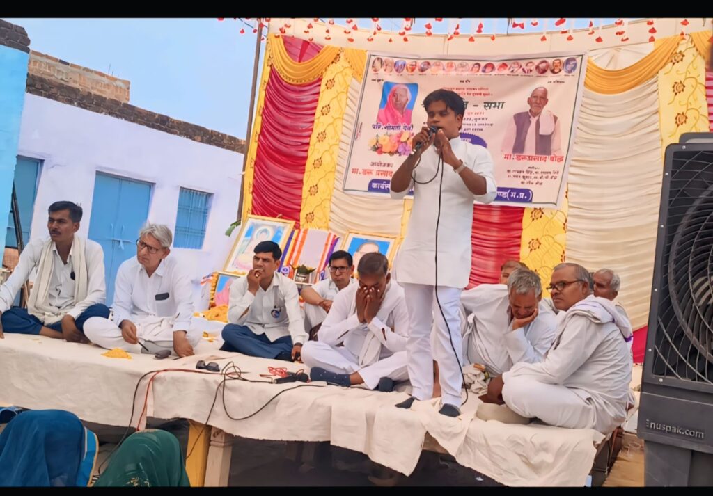 दबोह :– दबोह के ग्राम डड़ुआ में रामजीलाल बौद्ध जी की माता जी परि.गोमती देवी जी के परिनिर्वाण पर शौक सभा का आयोजन किया और मृत्यु भोज को हमेशा बंद करने का निर्णय लिया जिसमें कई सामाजिक और राजनीतिक लोग उपस्थित हुए सबसे बुद्ध बंधना और पंचशील भिक्षु संघ ने कराकर कार्यक्रम की शुरुआत की जिसमें कार्यक्रम की अध्यक्षता दादा मतदीन कुशवाह पटवारी जी ने किया और कहा कि समाज में कोई भी कुरीति हो उसको बंद ही होना चाहिए यह हमारा पहला काम है मुख्य वक्ता के रूप में जेपी सर पूर्व ब्लॉक शिक्षा अधिकारी रहे शिवचरण कुशवाह , आर पी मल्होत्रा , कवि भागीरथ सिरोलिया, कवि नरेश बाबू बौद्ध ,एवं अन्य वक्ताओ ने अपनी बात रखी सोशल एक्टिविस्ट इंजी. वीरू धनोलिया ने अपने वक्तव में कहा कि आज समाज में कई कुरीतियों से समाज जकड़ा हुआ है समाज को पहले कुरीतियों से बाहर निकलने के लिए शिक्षा बहुत जरूरी है आज अगर जरूरत है तो सत्ता हासिल करने की जरूरत है इस बात को जितना जल्दी हो सके समझ जाना चाहिए आज की युवा पीढ़ी को जागरूक होकर आगे आना चाहिए अपना उद्धार करने कोई नहीं आएगा आपको खुद ही आपको अपने हक अधिकार को खुद ही सम्मान पूर्वक बचाकर रखना है और अगर सम्मान से जीना है तो पहले अपने हक अधिकार को बचाने की कोशिश करो क्योंकि आज कुछ भेड़िए आपके हक अधिकार को खत्म करने की कोशिश कर रहे है उसका उन्हीं की भाषा में जवाब देना सीख लो आपकी तरफ कोई उंगली भी नहीं दिखा सकता है और एक बात याद रखना “शेर की न बलि हुई,बकरे बेली पर चढ़ाए गए” आगे धनोलिया ने जानकारी देते हुए बताया कि मान सम्मान की रक्षा के लिए 20 जून 2025 से आलमपुर से भिण्ड तक” सम्मान बचाओ यात्रा ” रखी गई है जिसमें 1. शिक्षा के जनक क्रांति ज्योति महात्मा ज्योतिबा फुले जी , देश की प्रथम शिक्षा का सावित्री बाई फुले जी एवं मान्यवर कांशीराम साहब जी को भारत रत्न से सम्मानित करो।
