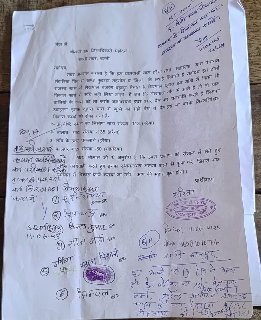 महिला प्रधान व गांव के ग्रामीणों ने मिलकर बस्ती एसडीएम सदर को शिकायती पत्र देते हुए लेखपाल को हटवाने की माँग।