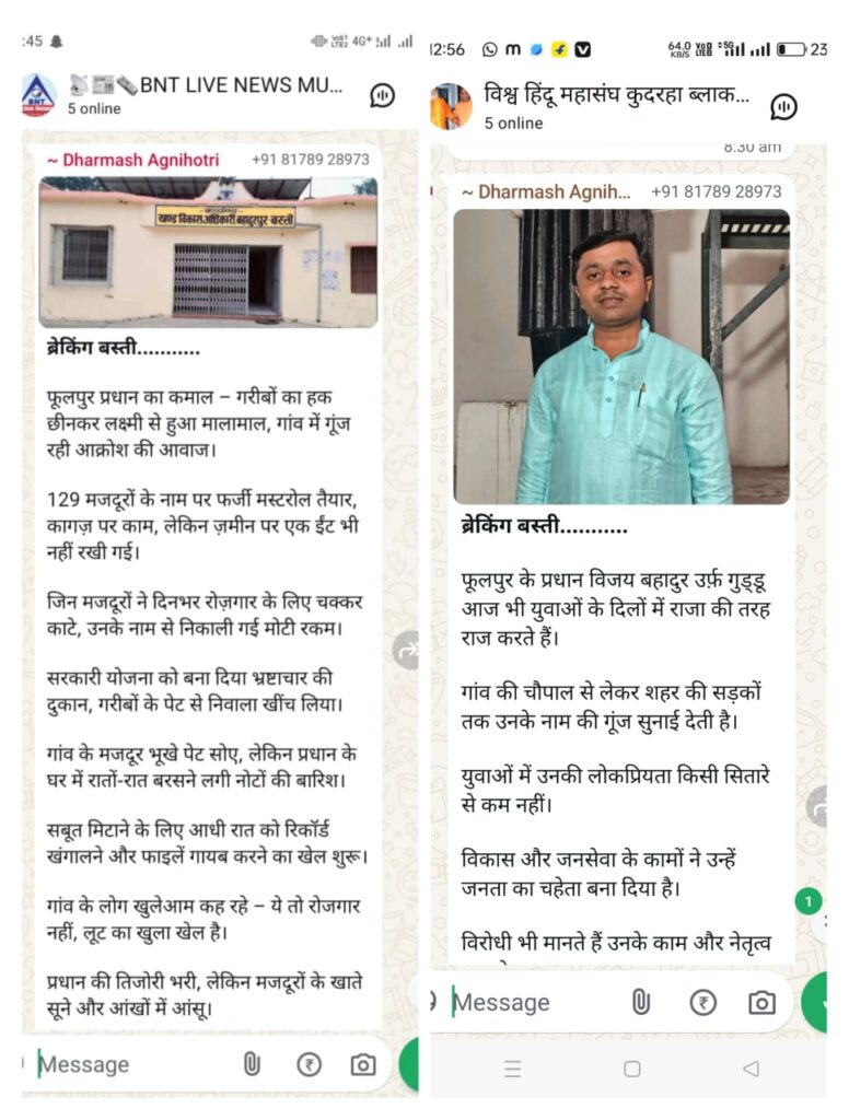 धर्मेश नामक व्यक्ति कथित पत्रकार , पत्रकारिता के नाम पर धब्बा फर्जी ब्रेकिंग में 30 मिनट पहले लिखा भष्ट्राचार 30 मिनट बाद जब प्रधान ने निकाल दी हवा तब करने लगा चमचागीरी