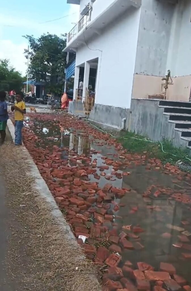 जलभरावसेपरेशान_लोग: उबड़-खाबड़ ईंटों से बनाई सड़क पर चलने को मजबूर”