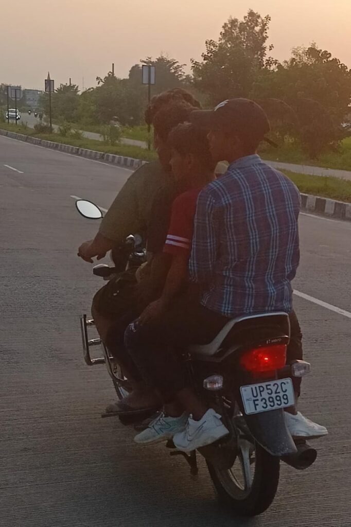 नाबालिक मोटरसाइकिल से फर्राटा भर दुर्घटना को दावत देते हैंमहाराजगंज।जिले के थाना श्याम देउरवां अंतर्गत गोरखपुर महाराजगंज फोरलेन पर रुद्रपुर भलूही गांव के सामने एक मोटरसाइकिल पर चार नाबालिक बच्चों को बैठाकर एक नाबालिक बच्चा फर्राटा भरते हुए बहुत तेज चला जा रहा था।विदित हो आए दिन इस रोड पर एक्सीडेंट में लोग अपनी जान गंवा रहे हैं। ऐसे समय में अभिभावक मोटरसाइकिल देकर चार या पांच बच्चों को बैठा कर चलना जीवन के साथ खिलवाड़ करना है। इस संदर्भ में बच्चे कम दोषी उनके अभिभावक ज्यादा दोषी हैं।पुलिस प्रशासन कहां-कहां किस-किस की जांच करें ।उसके लिए भी समस्या है। जब तक इस संदर्भ में अभिभावक जागरूक नहीं होंगे ,रोड दुर्घटना रूकना संभव नहीं है। पुलिस विभाग को भी समय-समय पर ऐसे वाहन चालकों को जांच करनी पड़ेगी।