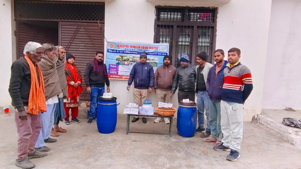 पीलीभीत/कलीनगर/खबर जनपद पीलीभीत तहसील काली नगर क्षेत्र से हैं जहां सोमवार को ग्राम नवदिया धनेष में सुचेतना समाज संस्था द्वारा गाँव के किसानो को जैविक खेती करने हेतु जीवामतृ बनाना सिखाया गया जिसमे गौ मूत्र,गौ गोवर, वेसन गुड को मिलाकर जीवामृत तैयार किया गया। आपको बता दें कि वहीं सभी किसानों को जीवामृत के फायदे एवं उपयोग करने के सही तरीके बताये गये जिसमे सभी किसानो की जीवामृत के बारे में समझ बनी इस दौरान सुचेतना संस्था स्टाल गुरमेल मसीह, संजय राठौर, जितेंद्र कुमार,हसमुखी देवी, नीरज देनी मौजूद रहे।