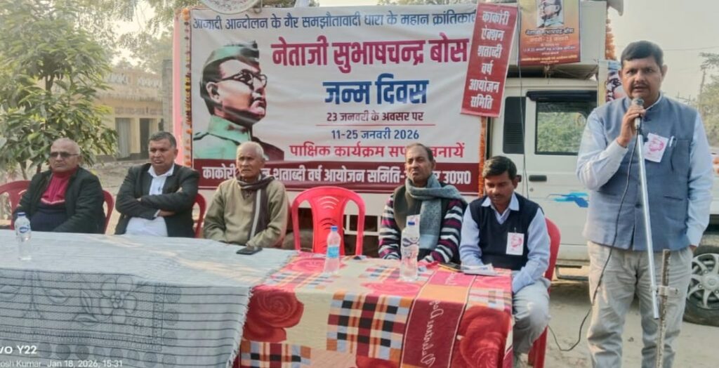 आजादी आन्दोलन के गैर समझौतावादी धारा के महानायक नेताजी सुभाषचंद्र बोस की 129वीं जयंती – 23 जनवरी के अवसर पर काकोरी-ऐक्शन शताब्दी वर्ष आयोजन समिति जौनपुर के आह्वान पर 11 जनवरी से 25 जनवरी तक पाक्षिक कार्यक्रम के तहत आज दिनांक 18 जनवरी 2026 को बदलापुर से शाहगंज तक एक बाइक जुलूस निकाला गया। इसके बाद शाहगंज के बड़ा गांव में जन सभा हुई। जिसमें काफी संख्या में छात्र नौजवानों ने भाग लिया।