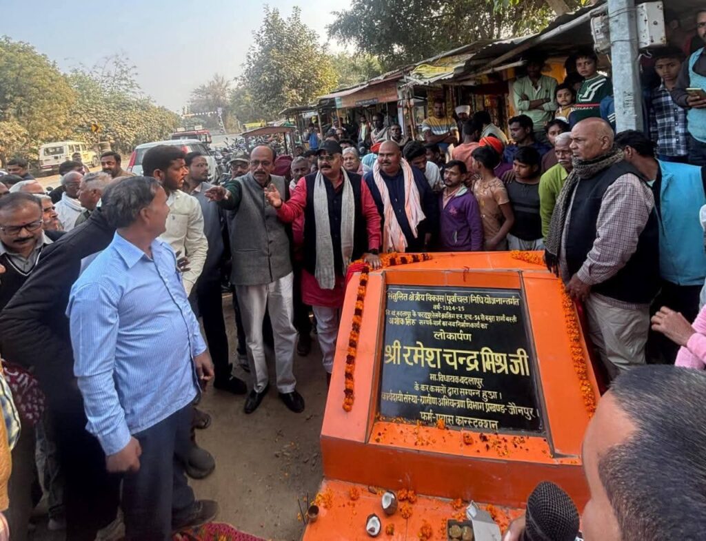 जौनपुर। बदलापुर विधानसभा क्षेत्र अंतर्गत पुराने एनएच-56 रेलवे क्रॉसिंग के समीप बबुरा शर्मा बस्ती संपर्क मार्ग के नवनिर्माण कार्य का बदलापुर विधायक रमेश चंद्र मिश्र ने किया लोकार्पण।