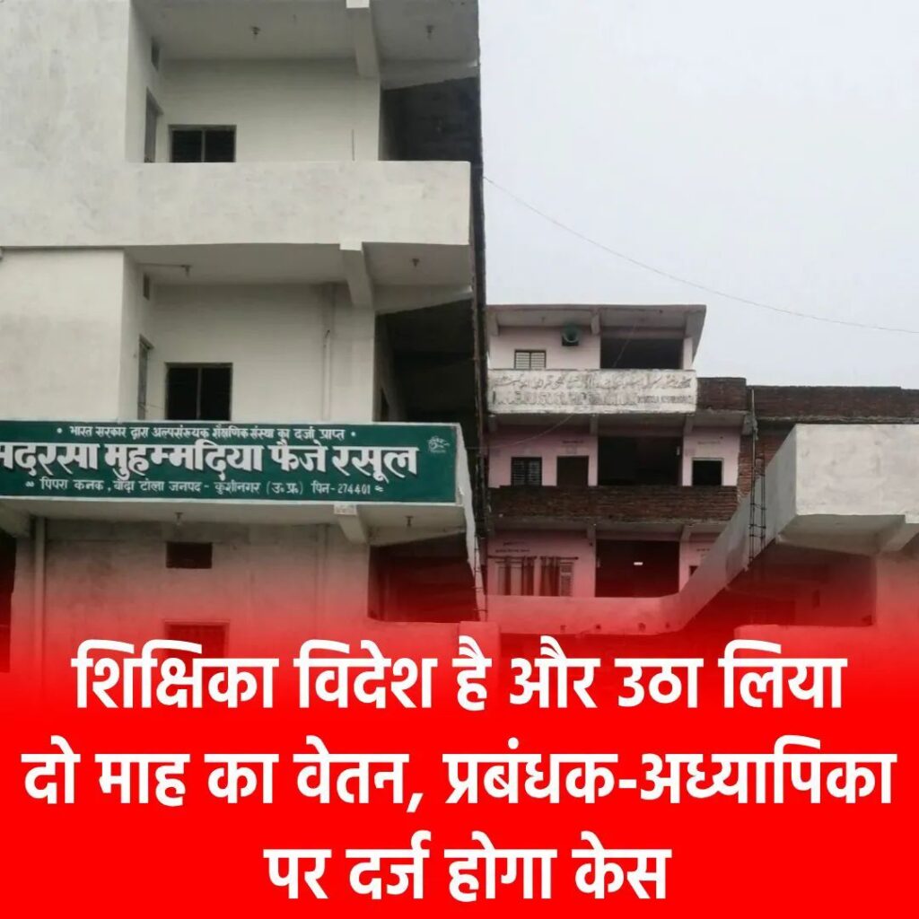 जिला अल्पसंख्यक कल्याण अधिकारी की जांच में स्पष्ट हुआ है कि मदरसे के प्रबंधक ने एक साजिश के तहत बेटी को सहायक अध्यापिका के पद नियुक्ति करायी। गलत तरीके से वेतन उठा रहे हैं। जबकि नियमानुसार किसी संस्था के प्रबंधक की संतान उसी संस्था में बतौर शिक्षक नियुक्त नहीं किए जा सकते। प्रबंधक पिता ने बेटी को विदेश भेज कर फरवरी व मार्च महीने माह का कूटरचित तरीके से वेतन निकाल लिया है। जिला अल्पसंख्यक कल्याण अधिकारी ने थाने में तहरीर सौंप फर्जीवाड़ा करने वाले प्रबंधक पिता व बेटी सहायक अध्यापिका के खिलाफ कार्रवाई की मांग की है। केस दर्ज होने के बाद अल्पसंख्यक विभाग की ओर से शिक्षिका पर विभागीय भी की जाएगी। ।मदरसे में तैनात हैं 15 शिक्षकपिपरा कनक के बोदा टोला में संचालित मदरसे में कुल 15 शिक्षक तैनात हैं। इसमें करीब साढे पांच सौ बच्चों का नामांकन है। यह मदरसा वर्ष 2015 से एड में आया है तथा शिक्षिका की तैनात वर्ष 2016 में हुई थी। बताया जाता है कि पिता ने बेटी की तैनाती के लिए कुछ समय के लिए किसी दूसरे को प्रबंधक नियुक्त कर दिया था। आरोप है कि तैनाती के कुछ साल बाद खुद प्रबंधक बन गया। मदरसा विनियमावली 2016 के तहत मदरसा प्रबंधक या प्रबंध समिति के किसी भी मेंबर के पुत्र व पुत्री का नियुक्ति उस मदरसे में नहीं हो सकती है। ऐसे में यह पूरी तरह असंवैधानिक है।निलंबित होगी शिक्षिका, मरदसे का होगा सिंगल ऑपरेशन: डीएमओजिला अल्पसंख्यक कल्याण अधिकारी (डीएमओ)भरत लाल गोंड ने बताया कि प्रबंधक व शिक्षिका के खिलाफ केस दर्ज होने के बाद उसकी कापी लगा कर रजिस्ट्रार मदरसा बोर्ड को भेजा जायेगा। इसके बाद रजिस्ट्रार के आदेश पर शिक्षिका को निलंबित करने के साथ प्रबंधकीय व्यवस्था का सिंगल ऑपरेशन किया जायेगा। बताया कि रजिस्ट्रार के आदेश पर गलत तरीके से निकाले गए वेतन की रिकवरी भी करायी जायेगी। विभाग इस मामले में पत्राचार करने में जुटा हुआ है।