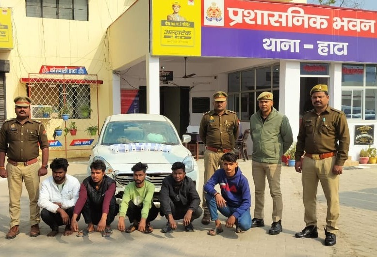 दिनांक 06.12.2024 को प्रार्थी अशोक कुशवाहा पुत्र स्व0 फूलचन्द कुशवाहा निवासी टीचर कालोनी सबेया थाना कसया जनपद कुशीनगर द्वारा 05/06.12.2024 की रात ढ़ाढ़ा ओवरब्रिज के पास से स्विफ्ट डिजायर कार के चोरी होने के संबंध में थाना कोतवाली हाटा पर तहरीर दिया गया। प्राप्त तहरीर के आधार पर थाना कोतवाली हाटा पर मु0अ0सं0 908/2024 धारा 303(2) बीएनएस में अभियोग पंजीकृत किया गया। घटना के शीघ्र अनावरण हेतु पुलिस अधीक्षक कुशीनगर श्री संतोष कुमार मिश्रा द्वारा अपर पुलिस अधीक्षक कुशीनगर श्री रितेश कुमार सिंह के पर्यवेक्षण व क्षेत्राधिकारी कसया श्री कुन्दन कुमार सिंह के नेतृत्व में टीमों का गठन किया गया। आज दिनांक 10.01.2025 को थाना कोतवाली हाटा व स्वाट की संयुक्त पुलिस टीम द्वारा घटना का अनवारण करते हुए घटना में सम्मिलित 05 नफर अभियुक्तों को गिरफ्तार कर उनके कब्जे से चोरी गये स्विफ्ट डिजायर कार, नकद 14,000/- रुपये, एक अदद लकड़ी का बाक्स माल मुकदमाती बरामद तथा गैंग द्वारा उक्त घटनाओ में प्रयुक्त 03 अदद मोबाईल फोन, अपराध में प्रयुक्त बिना नम्बर की पल्सर मोटरसाइकिल व 02 अदद अवैध तमंचा 315 बोर व 04 अदद जिन्दा कारतूस बरामद किया गया। बरामदगी व गिरफ्तारी के आधार पर उपरोक्त मुकदमे में धारा 317(2) व 3/25 आर्म्स एक्ट की बढ़ोत्तरी कर अग्रिम विधिक कार्यवाही की जा रही है।