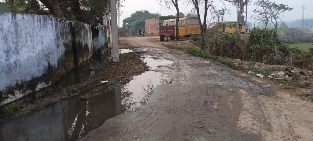 नली बदहाल टूटा फूटा नाली सड़क के ऊपर से बहता गंदा पानी बगल में सरकारी स्कूल ग्रामीड व् बच्चों को आने जाने में काफी समस्या का करना पड़ता है सामना
