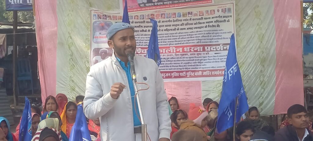 बस्तीभारत मुक्ति मोर्चा जिला अध्यक्ष आर के आरटीएम द्वारा 6 सूत्र मांग लेकर हुआ धरना प्रदर्शन शास्त्री चौक पर शुरू हुआ निश्चित कालीन धरना प्रदर्शन ग्रामीणों द्वारा जमीन की मांग कर रहे
