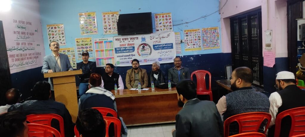 नशा मुक्त समाज हमारा संकल्प” शीर्षक के अंतर्गत आज एक विचार गोष्ठी का आयोजन फलाह ए आम इस्लामिक स्कूल पंजबियांन में किया गया विदित हो कि जमात ए इस्लामी हिन्द की ओर से 14 फरवरी से 23 फरवरी तक चलाए जा रहे” नशा मुक्ति अभियान” का आज अंतिम दिन था उसी के लिए विभिन्न धर्मों के बुद्धिजीवियों ने इस विचारगोष्ठी अपने अपने विचार प्रस्तुत किये कार्यक्रम का शुभारंभ हाफ़िज़ नईम नदवी ने तिलावते क़ुरआन से किया ज़िला संयोजक अतीक़ अहमद इस्लाही ने मुहीम का परिचय कराया । वाल्मीकि सेना (अटल) के राष्ट्रीय अध्यक्ष श्री अटल वाल्मीकि ने समाज मे नशे के बढ़ते प्रभाव पर चिंता व्यक्त की ,मेथोडिस्ट चर्च के इंचार्ज पास्टर डी हरमन ने बाईबल के उदाहरण से नशे की बुराई को समझाया और इससे बचने पर ज़ोर दिया, पूर्व आयकर अधिकारी श्री सी लाल जी ने कहा कि इसके लिए सभी लोगों को आगे आना होगा और ये क्यों किया जाता है उसपर भी प्रकाश डाला,सामाजिक कार्यकर्ता श्री टी एच् खान ने कहा कि सबसे पहले इसकी शुरुआत अपने घर से करनी होगी और फिर समाज को जागरूक करना होगा और ये सामुहिक प्रयास करना होगा,कार्यक्रम की अध्यक्षता कर रहे मुरादाबाद से आये अभियान के प्रदेश सह संयोजक
