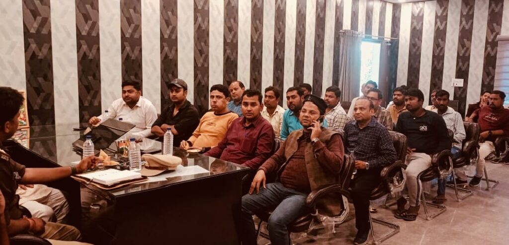 नगर पंचायत परतावल बाजार विकास खंड परिसर मे थाना प्रभारी ने व्यापारियों के साथ की बैठक।