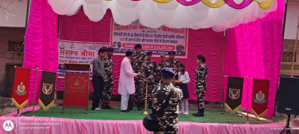 महाराजगंज जनपद के निचलौल तहसील के अंतर्गत ठूठीबारी में सरस्वती विद्या मंदिर जूनियर हाई स्कूल के प्रांगण में सशस्त्र सीमा बल भारत नेपाल एवं भारत भूटान सीमा के सजग प्रहरी नशा मुक्ति अभियान, व नागरिक कल्याण कार्यक्रम के अंतर्गत सीमावर्ती क्षेत्र के 50 किसानों के लिए सात दिवसीय डेयरी फार्मिंग प्रशिक्षण कार्यक्रम एवं श्री अन्न के बीज और फलदार पौधों के वितरण कार्यक्रम दिनांक 6.3.2025 से 12.3.2025 तक 22वीं वाहिनी सशस्त्र सीमा बल महाराजगंज उत्तर प्रदेश के द्वारा कार्यक्रम को चलाया जा रहा है जिससे सीमा के समीप बॉर्डर के किनारे के किसानो का आय को दोगुना करने व बढ़ाने का कार्यक्रम किया जा रहा है इससे किसानों को डेरी फार्म का प्रशिक्षण व डेयरी को चलाने के लिए अच्छा सहयोग मिलेगा किसान की आय दुगना हो सके 22वीं वाहिनी के *सेकंड कमांडेंट नरेश कुमार जागीर व विवेक सर मुख्य अतिथि के रूप में कार्यक्रम दीप प्रज्वलित कर कार्यक्रम को आगे बढ़ाया तथा ट्रेनर मनीष जी आलोक कुमार देवनाथ एस. आई. ,अजीत तेंदुलकर एस. आई.,जयकिशन एस. आई. ,सुमित इक्का एस. आई. सुरेखा फाउंडेशन के सचिव शिवेंद्र शिंह व प्रधानाचार्य सरस्वती विद्या मंदिर जूनियर हाई स्कूल ठूठीबारी इत्यादि लोग मौजूद थे