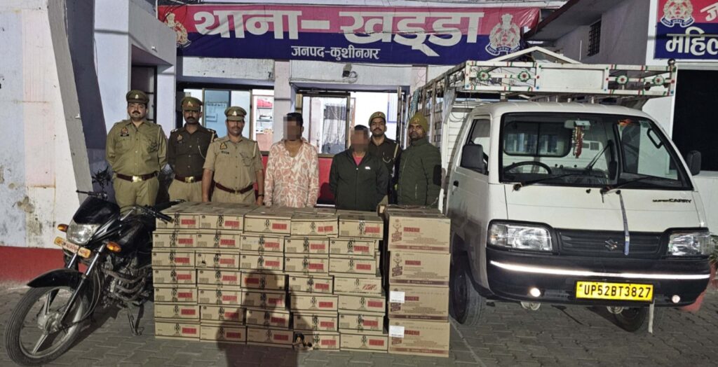 पुलिस अधीक्षक कुशीनगर संतोष कुमार मिश्रा के निर्देशन एवं अपर पुलिस अधीक्षक कुशीनगर रितेश कुमार सिंह के पर्यवेक्षण व क्षेत्राधिकारी खड्डा श्री उमेशचन्द भट्ट के नेतृत्व में अवैध शराब बिक्री/निष्कर्षण/परिवहन के रोक थाम हेतु चलाये जा रहे अभियान के क्रम में दिनांक 08.03.2025 को थाना खड्डा एवं स्वाट की संयुक्त पुलिस टीम द्वारा चेकिंग के दौरान बरवारतनपुर के समीप एक पिकप वाहन UP52BT3827 से तस्करी कर ले जायी जा रही 113 पेटी विभिन्न ब्रॉण्ड की अवैध अंग्रेजी शराब(जिसमें 97 पेटी 8 पीएम एवं 16 पेटी रायल स्टैग व्हस्की) तथा एक अदद प्लेटिना मोटरसाइकिल नं0 UP57AD0258( वाहन सहित कुल कीमत 18,50,000/- रुपये) के साथ 02 शराब तस्करों 1- गुड्डू उर्फ कोशल किशोर पुत्र राम प्यारे निवासी बन्धू छपरा थाना खड्डा जनपद कुशीनगर 2- नीरज कुमार पुत्र स्व0 शम्भू निवासी नरकटिया थाना शिकारपुर जनपद बेतिया बिहार को गिरफ्तार किया गया है। बरामदगी व गिरफ्तारी के आधार पर थाना खड्डा पर मु0अ0सं0-70/25 धारा 60/72 आबकारी अधि0 में अभियोग पंजीकृत कर अग्रिम विधिक कार्यवाही की जा रही है।